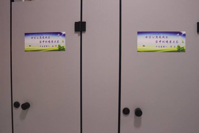 经过公司研究,安排大一班级承包公厕卫生,大二员工负责监督管理,为了责任到班、责任到人,公司张贴卫生监督管理人员名单,并选出总负责人,总揽全局。同时,为了提醒广老员工,在楼道、公厕张贴多条文明标语,号召全体员工,要文明如厕、爱护劳动。