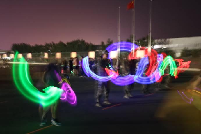 活动伊始,各个公司为大家带来精彩的开场舞和青春昂扬的歌曲,点燃了全体参与师生的热情。本季“耀动你心”荧光夜跑活动在沿袭上季经验的基础上,又添加了荧光T恤DIY趣味环节,同学们把奇思妙想和情感表达借助荧光笔绘制在白色T恤上,化身为一个个与众不同、荧光闪闪的“小精灵”,吸引无数路过同学的驻足观看。在准备工作完毕后,随着员工处副处长赵琳老师发出开始指令,500余名参与者一起出发,戴着荧光头饰、手握荧光棒将操场点缀成荧光的海洋。本次活动规则为每跑一圈进行一项娱乐游戏,娱乐游戏有“舞动我青春”、“运动我快乐”“有胆来突破”“默契大考验”等四项活动,四项活动完成后,进行最终评分,用时最少者获胜。活动结束后,大家纷纷表示此次“耀动我心”荧光夜跑活动,让自己感受到了青春运动的魅力与活力。