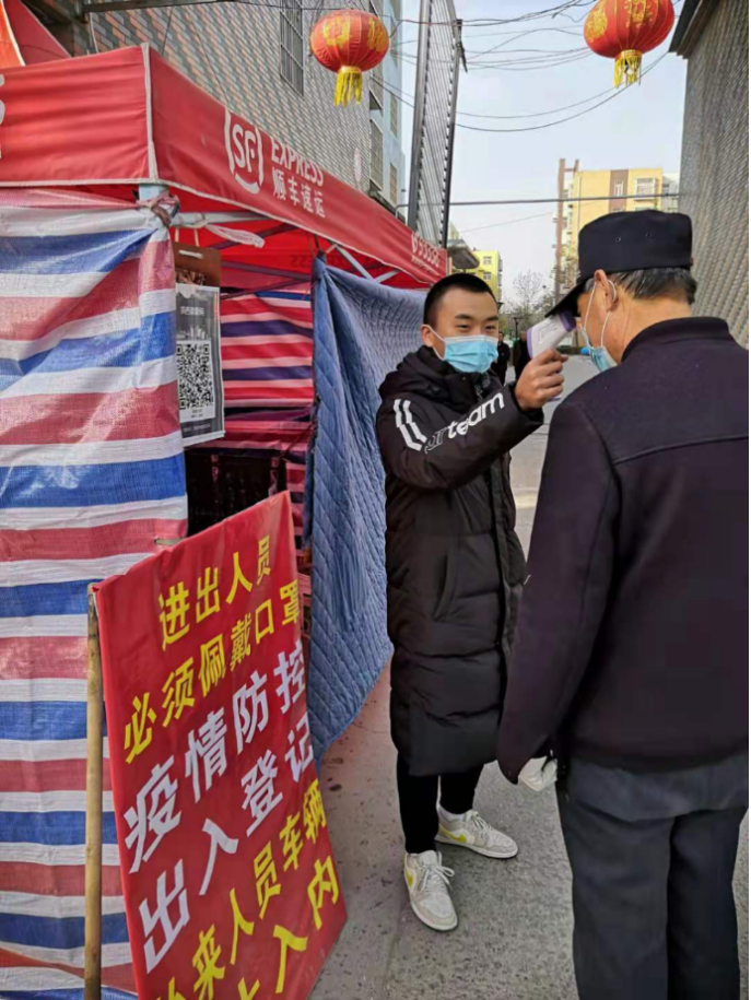 电气193D班高元伟,在陕西省渭南市白水县居苑小区社区志愿服务站做疫情志愿者,负责为防盗门和电梯内按钮消毒,同时对小区内外来人员进行检查测温。