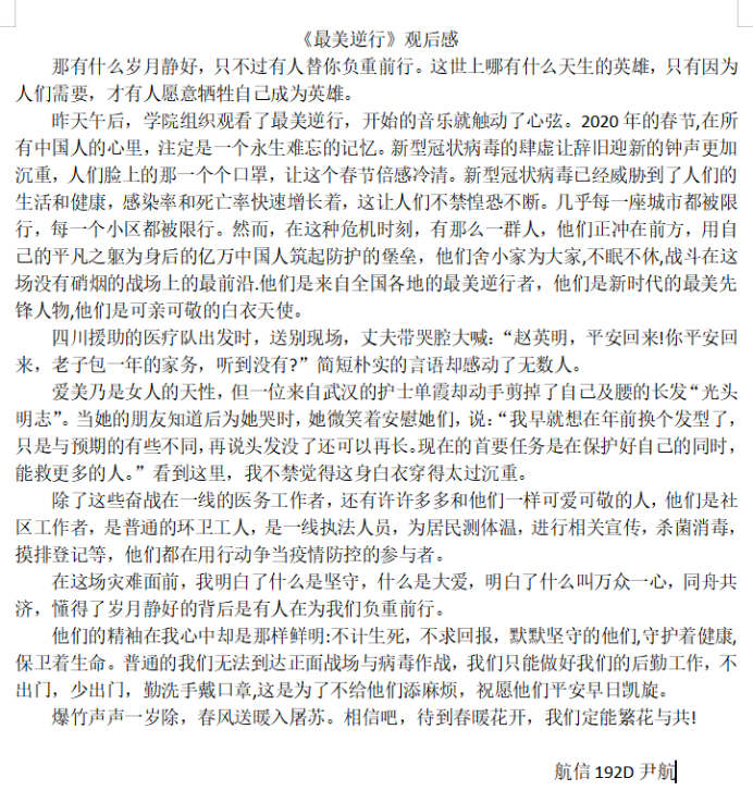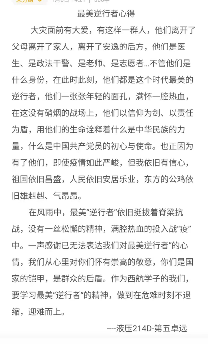 疫情的发生,让历史扑面而来,士官生不再是置身事外的观众,而是被推入其中的主角,士官生将秉承着“不给人民添麻烦,不给国家添麻烦”的思想观念,继续发扬士官作风,做自己力所能及之事,共度疫情。隔离不隔情,向白衣天使致敬!他们是黑暗里的光;是冲到最前线的战士;是顶着大风勇敢上前的逆行者!