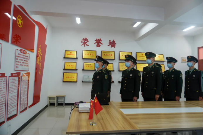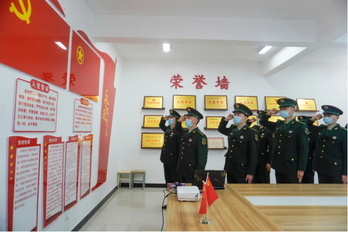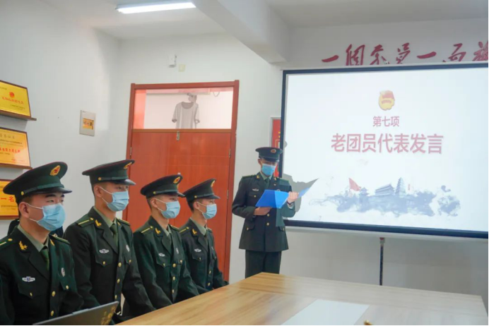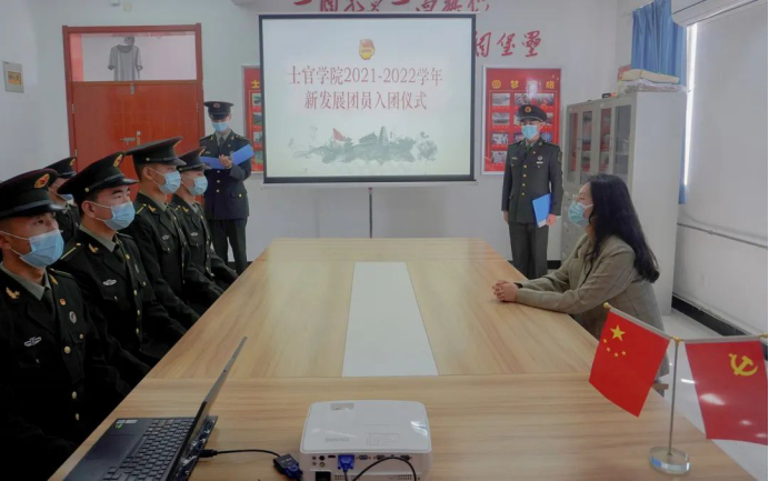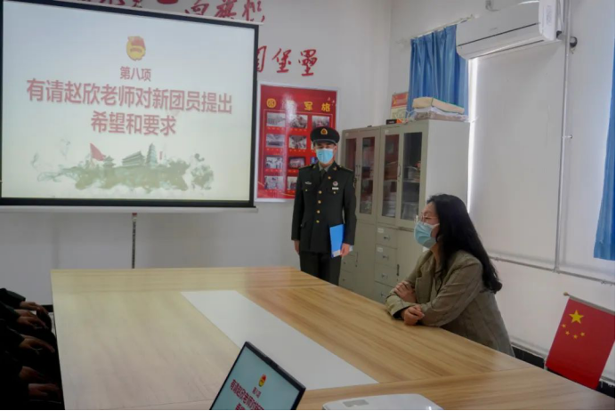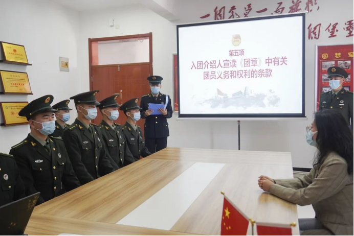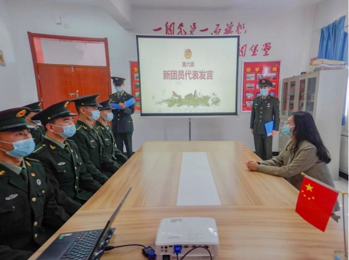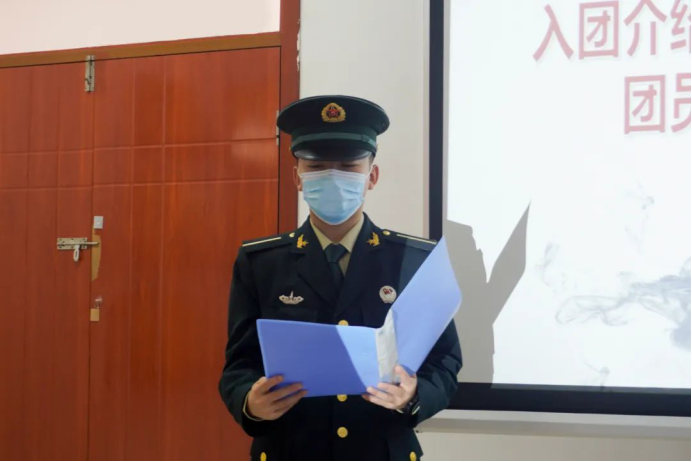 会议伊始,全体起立奏唱国歌。随后,主持人宣读五名新发展的团员名单。
