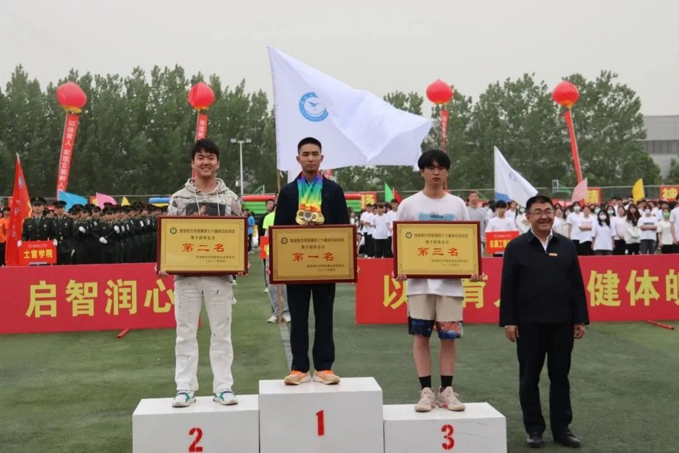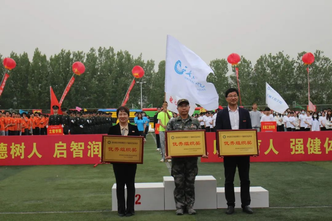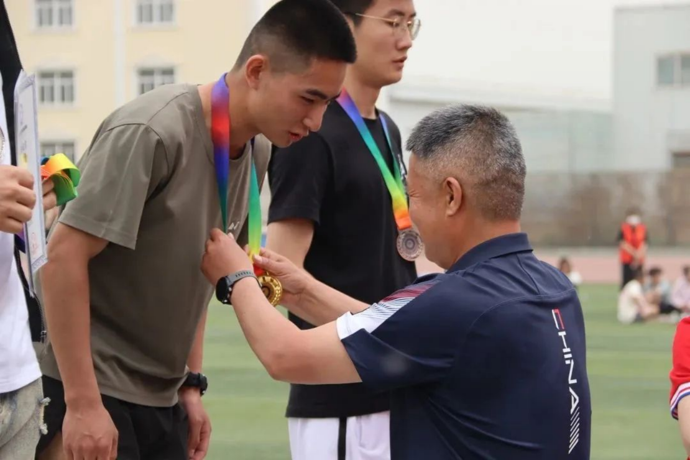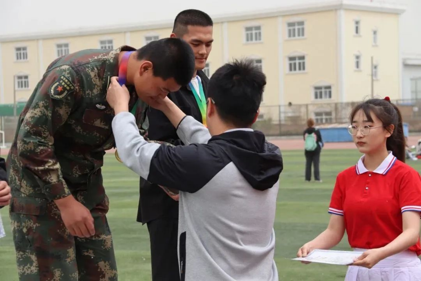 随着比赛项目的结束,运动场上人声鼎沸,运动员们迎来了属于他们的荣誉,随着广播出一个个获奖运动员的名字,颁奖老师为运动健儿们颁发属于他们的荣誉勋章。