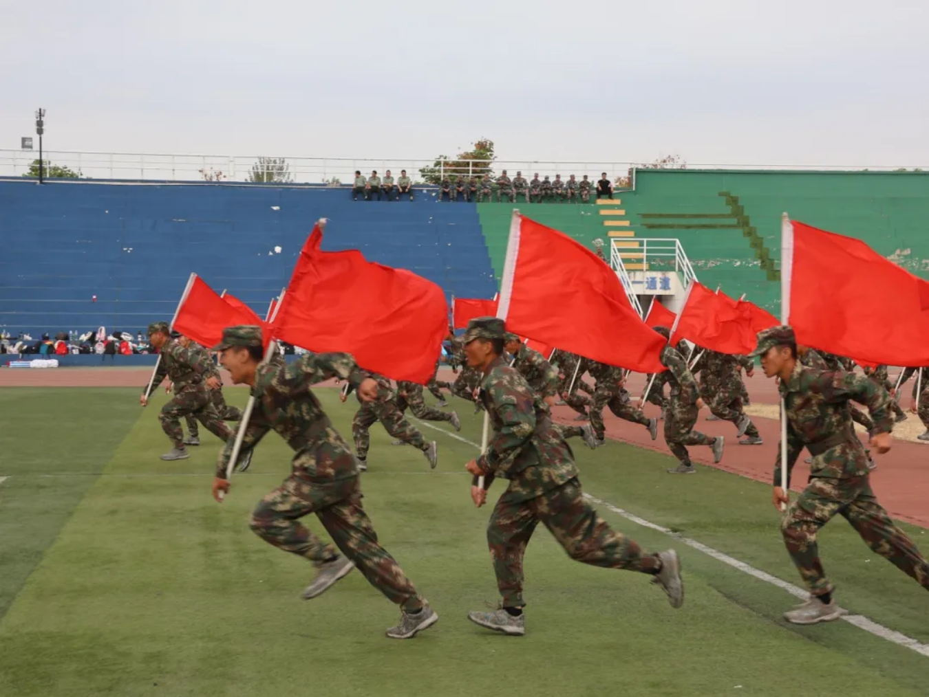 舞旗表演中,你们整齐划一,气势如虎,画出波涛山河。