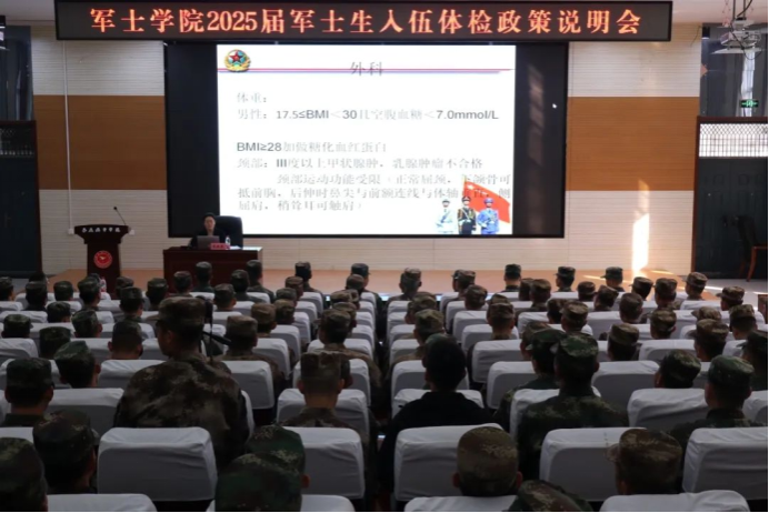 为做好js33333金沙线路检测2025届军士生入伍前体检工作,使军士生落实好体检相关要求,解决体检中的疑难杂惑,提高入伍合格率。11月8日下午,js33333金沙线路检测在报告厅组织召开2025届军士生入伍体检政策说明会。本次会议特邀西安交通大学第一附属医院东院区体检科主任史晓燕主讲,全体2025届军士生参加,会议由js33333金沙线路检测经理张军主持。