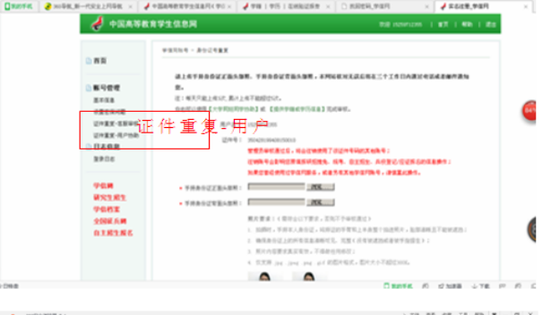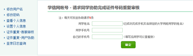 通过左侧菜单的“证件重复-用户协助”来解决证件号码重复的问题。进入页面后点击发送协助请求按钮,输入同班同学姓名等信息(注册的真实信息和手机号码),发送一条求助信息即可。
