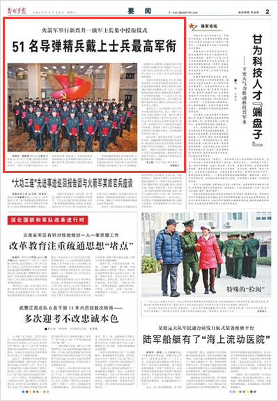 解放军报讯胡新辉、特约记者李永飞报道:51名“兵王”齐聚,晋衔思责荣誉催征。3月23日上午,火箭军机关举行新晋升一级军士长集中授衔仪式,来自战备训练、国防施工、作战保障等各条战线的51名导弹精兵接过命令状、戴上新军衔,载誉前行开始新的“砺剑突击”。