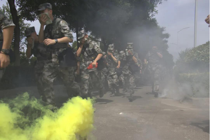 “快速通过染毒地带”,学员们用打湿的毛巾捂住嘴鼻,迅速通过毒区。