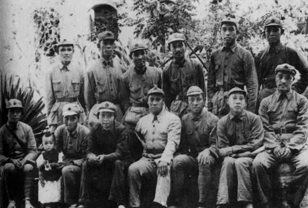 1937年8月13日,贺龙(前排右1)、关向应(后排右3)、王震(后排右2)贺炳炎(前排右4)、谭友林(后排右1)、