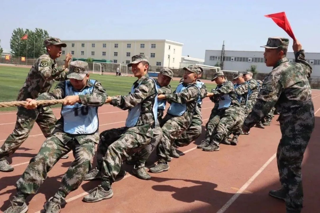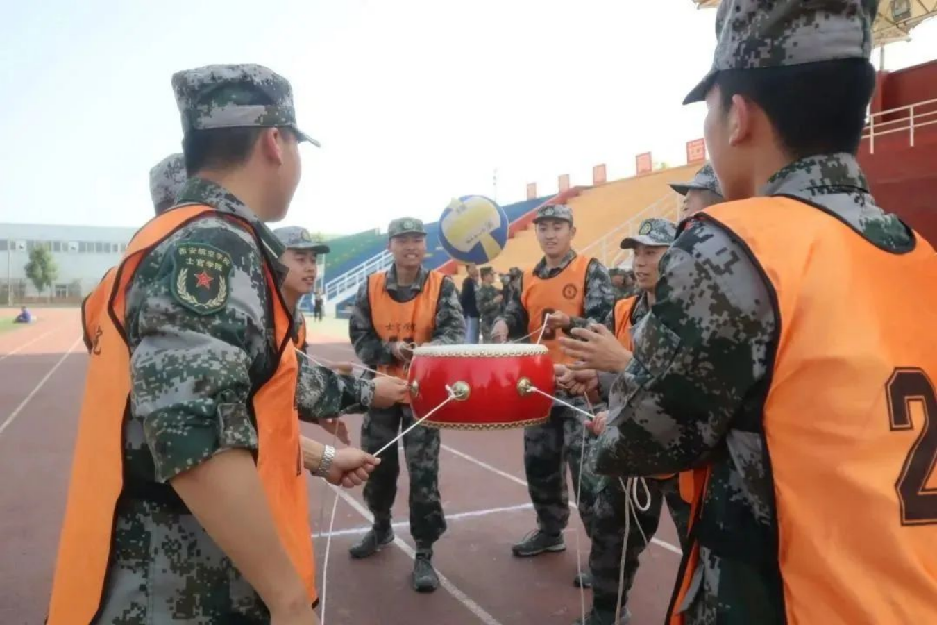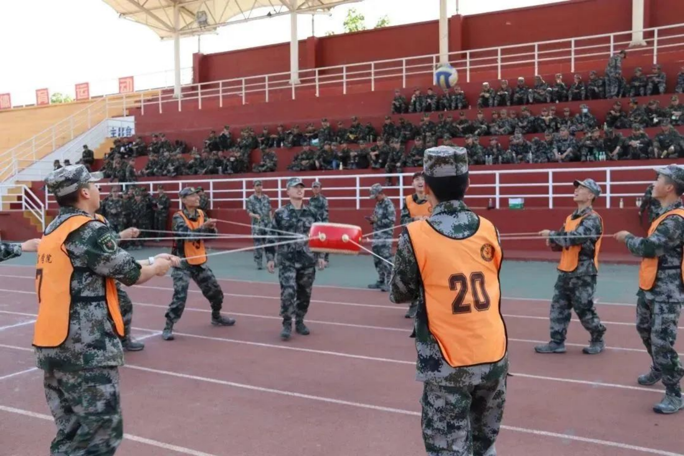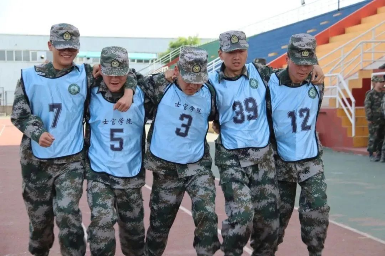 击鼓催征,团结是金;奋楫扬帆,勇往直前。接下来是五人六足比赛,军士学员们凝心聚力,伴随着整齐的口号一往无前,取得优异成绩。