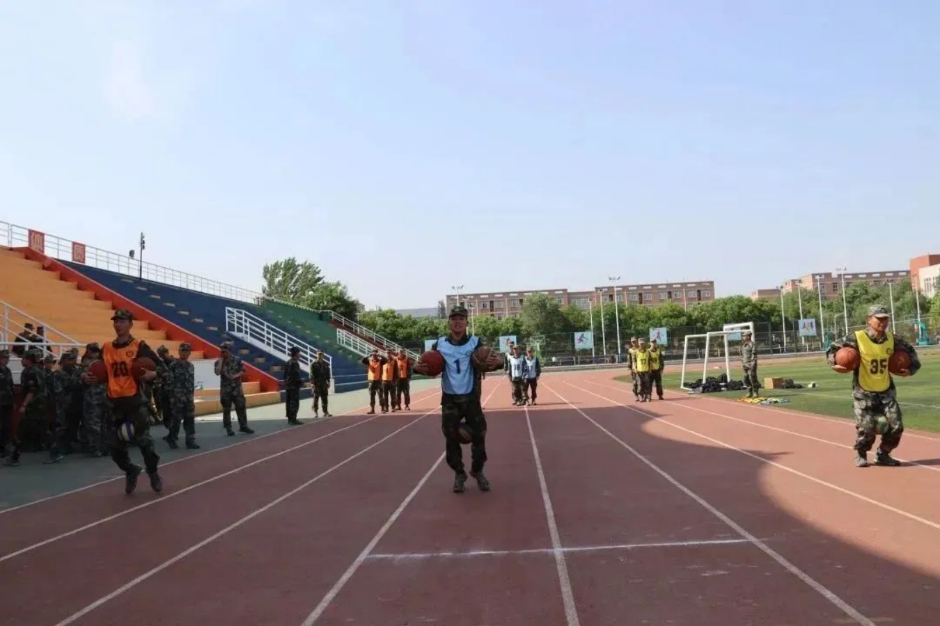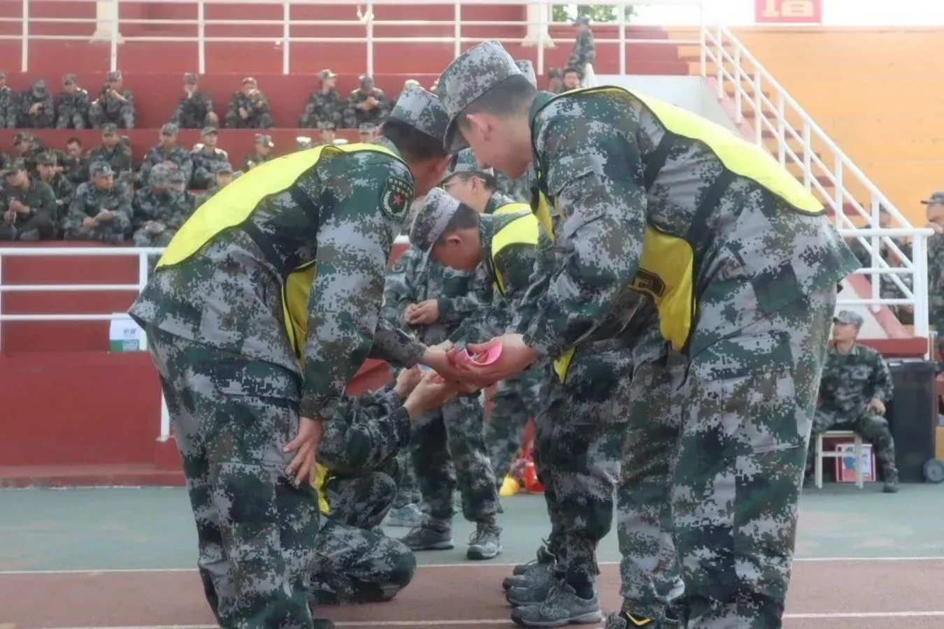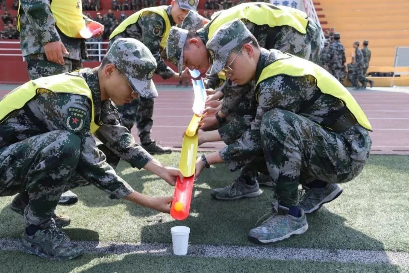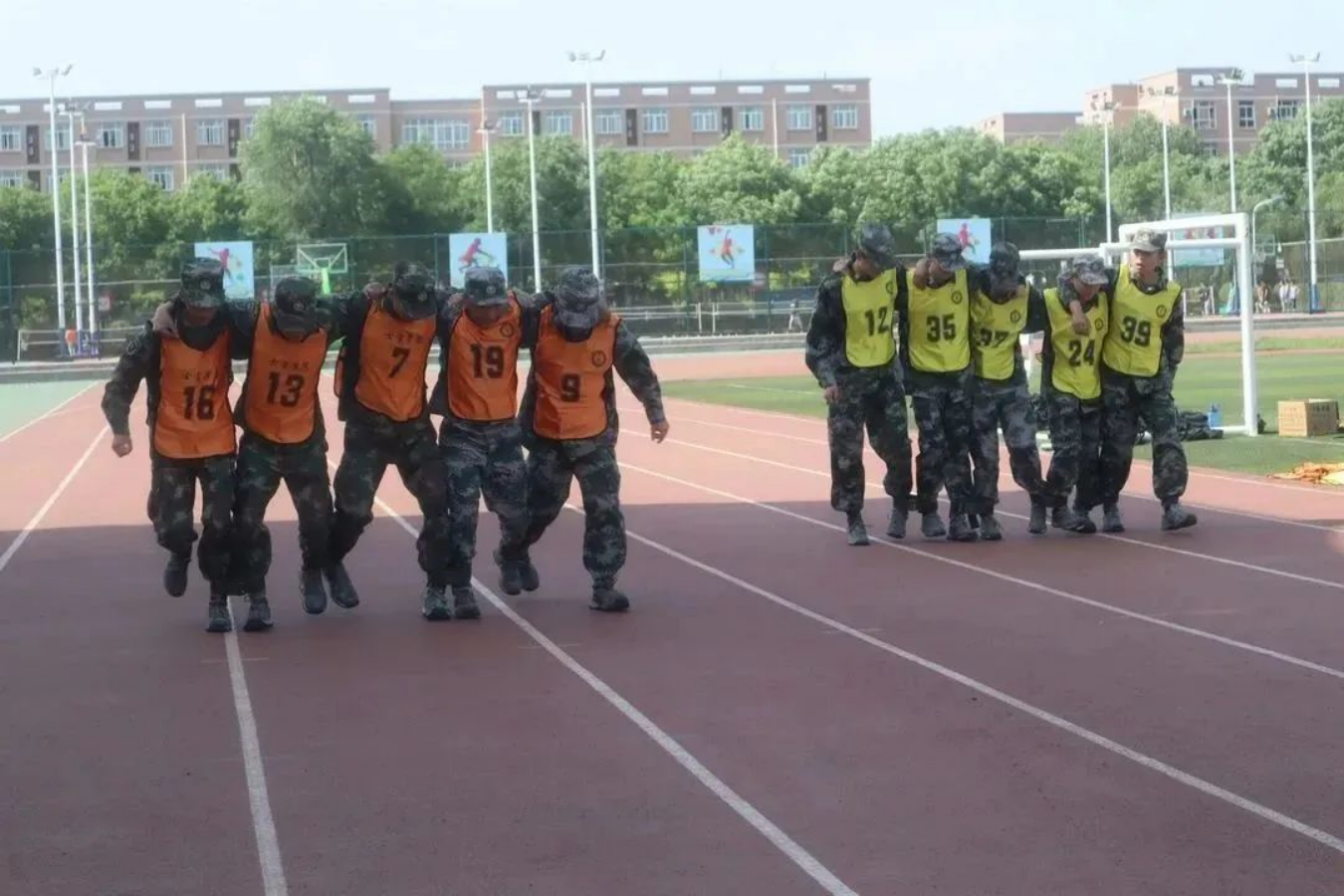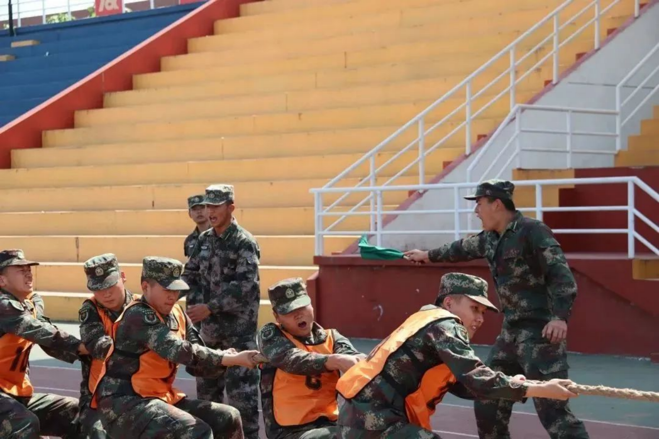 击鼓催征,团结是金;奋楫扬帆,勇往直前。接下来是五人六足比赛,军士学员们凝心聚力,伴随着整齐的口号一往无前,取得优异成绩。